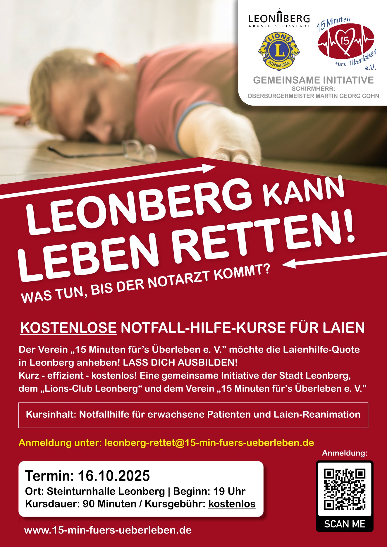Im dritten Jahr in Folge veranstaltete der LC Leonberg und der Verein "15 Minuten für's Überleben e. V." am 16. Oktober 2025 einen Notfallhilfekurs für erwachsene Patienten und zur Laien-Reanimation unter der Schirmherrschaft von Oberbürgermeister Martin Georg Cohn in der Leonberger Steinturnhalle.